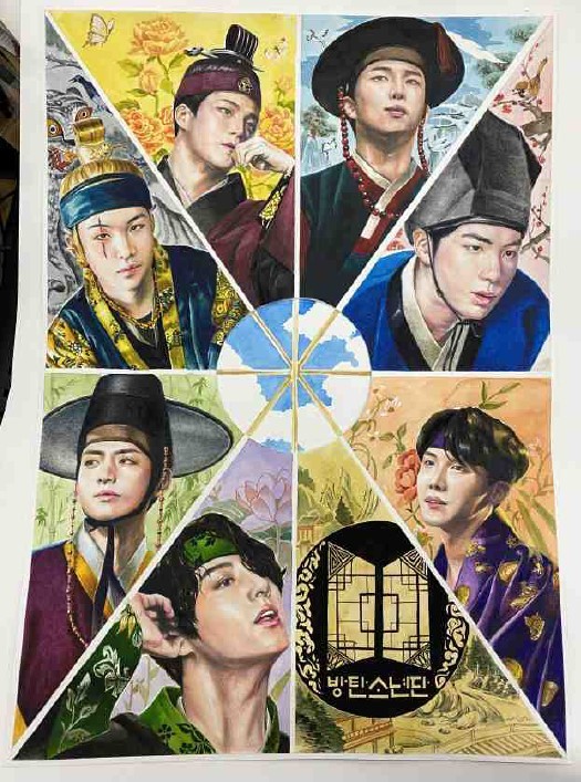 최우수상작 ‘팔도강산’은 우리나라 대표 전통의상인 한복을 각 멤버들의 개성에 맞게 입히고, 얼굴은 색연필을 이용해 사실적으로 표현했다. 의상과 뒷 배경은 모두 수채화로 표현해 꽉찬듯 보이지만 과하지 않은 화려함을 더해줬다.