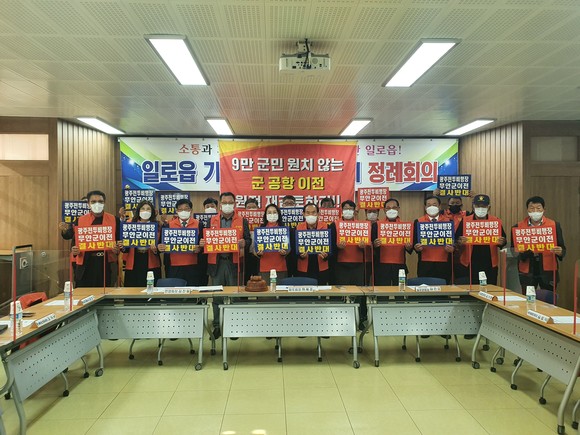 지난달 29일부터 해재면, 현경면 망운면 주민들의 군 공항 이전 반대 결의대회에 이어 지난 16일 일로읍 군 공항 무안 이전 반대 범국민대책위원회(이하 일로읍 범대위)를 비롯한 일로읍 기관사회단체장 28명은 일로읍사무소 2층 회의실에서 군 공항 무안 이전 반대를 위한 릴레이 결의대회를 가졌다.