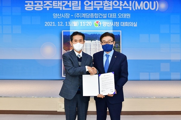 (주)계담종합건설 및 본청건축사 사무소 오태원 대표는 양산시 물금읍 가촌 출신으로 100억원 상당의 100여 세대 공공주택을 건립해 기부하기로 하고, 양산시는 이를 수락, 지난 13일 양해각서를 체결했다.