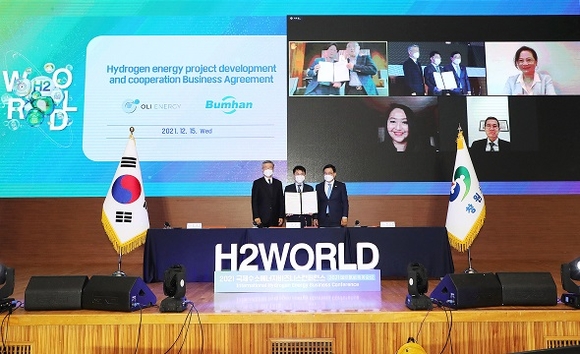 경남 창원시는 지난 15일 시청 시민홀에서 허성무 시장, 정영식 범한퓨얼셀 대표이사, 범대복 한국부울경중화총상회장이 참석한 가운데 호주 올리에너지(OliEnergy) 카터콩 회장, 임해강 호주 빅토리아주 중화총상회장 등과 화상회의를 열어 범한퓨얼셀과 올리에너지간 '호주 수소산업 시장 진출을 위한 협약'을 체결했다.