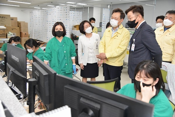 황수현 의료원장으로부터 의료원의 코로나19 환자 진료 상황과 병상 확보 및 가동 현황 등 설명을 듣고 모니터링룸과 선별진료소를 차례로 방문하여 환자 진료 및 관리 체계 등 상황을 살피고 직원들의 애로사항을 청취했다.