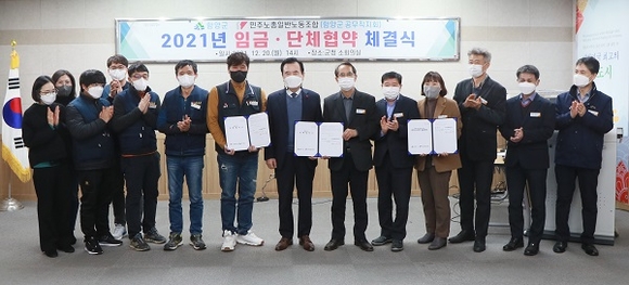 경남 함양군은 지난 20일 군청 소회의실에서 민주노총일반노동조합 함양군지회와 2021년 임금협약 및 단체협약을 체결했다.