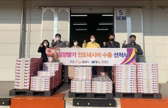 경남 밀양시는 22일 손재규 농업기술센터 소장, 박석제 밀양물산 주식회사 대표, 김효경 6차산업과장 등 6명이 참석한 가운데 밀양 딸기 인도네시아 수출 선적식을 가졌다.