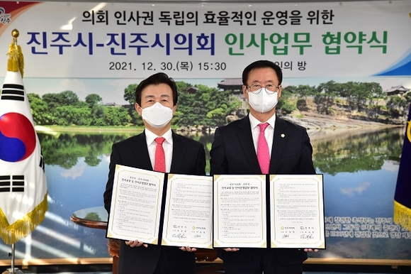 이상영 진주시의회 의장과 조규일 진주시장은 30일 시청 기업인의 방에서 지방의회 인사권 독립에 따른 인사운영 업무협약을 체결했다.