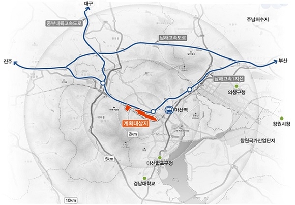 시는 공동주택 5930세대(분양 3650 임대 2280) 등 주거용지 29만 1196㎡(41%)와 도로, 공원 등 기반시설용지 41만 2758㎡(59%)를 비롯해 창원지방법원 마산지원, 창원검찰청 마산지청, 마산회원구청 등 13개 공공기관이 들어설 부지를 조성한다는 계획이다.
