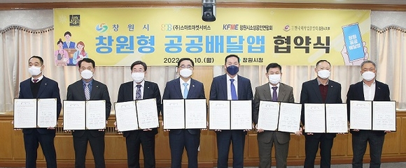 경남 창원시는 10일 오후 3시 시정회의실에서 소상공인들의 배달앱 중개 수수료 절감을 위해 ㈜스마트마켓서비스와 창원시소상공인연합회, 한국외식업중앙회 창원시 5개구 지부 등과 '창원형 공공배달앱 운영사업 업무협약식'을 가졌다.