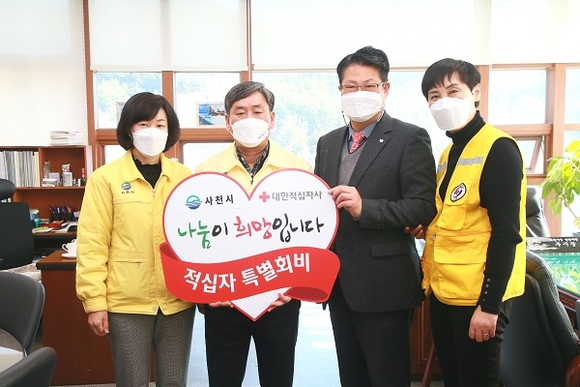 경남 사천시는 19일 시청 부시장실에서 주변의 어려운 이웃을 돕는 대한적십자사 경남지사에 특별회비 100만원을 전달했다고 밝혔다.