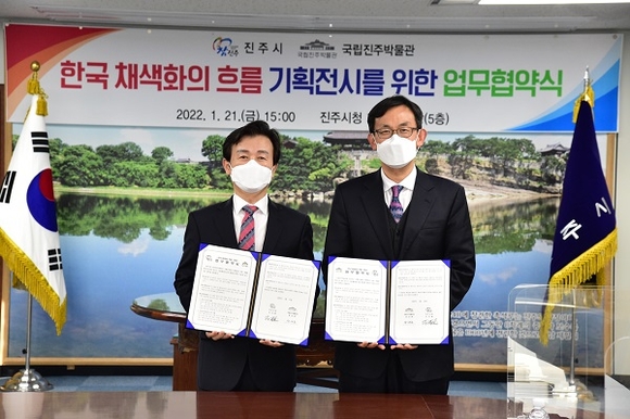 경남 진주시는 21일 시청 기업인의 방에서 조규일 시장과 장상훈 국립진주박물관장 등 관계자 7명이 참석한 가운데 국립진주박물관과 기획전시 '한국 채색화의 흐름' 개최를 위한 업무협약을 체결했다.