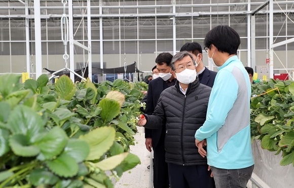 이날 방문은 경남 스마트팜 혁신밸리 조성사업의 진행사항을 파악하고 사업 관계자들과 교육생들을 격려하며, 청년 스마트팜창업 정책에 대해 의견을 나누기 위해 마련됐다.