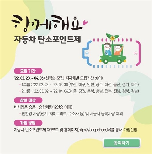참여를 희망하는 경우 자동차 탄소포인트제 누리집에서 회원 가입 후 자동차 번호판 사진, 누적 주행거리 계기판 사진, 자동차등록증 사본을 제출하면 된다.