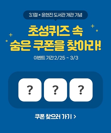 먼저 3.1절을 맞아 양산의 대표 독립운동가인 윤현진 선생을 시민들에게 널리 알리고, 그의 이름을 딴 도서관의 개관을 기념해 초성퀴즈 이벤트를 오는 25일부터 3월 3일까지 진행한다. 퀴즈 정답자 전원에게 2천원의 쿠폰을 실시간으로 지급한다.
