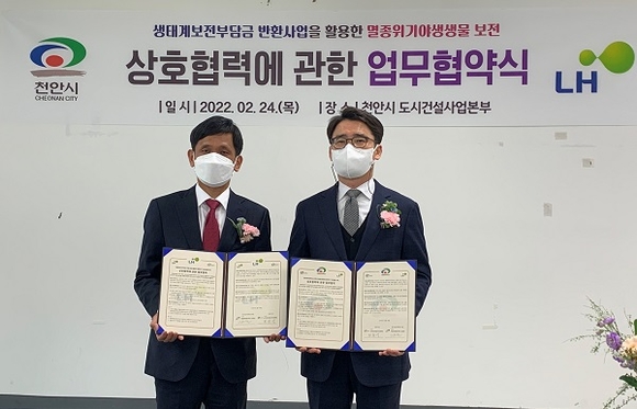 한국토지주택공사(LH)는 24일 충남 천안시와 '생태계보전부담금 반환사업을 활용한 멸종위기 야생생물 보전 상생 업무협약'을 체결했다.