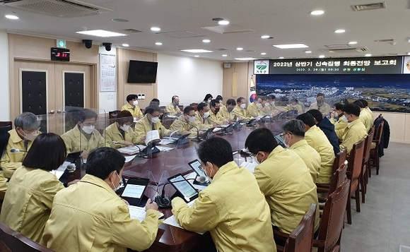 이날 군청 상황실에서 열린 대책보고회에서는 본청 및 사업소 전 부서장들이 참석한 가운데 상반기 신속집행 목표율 달성을 위한 세부 집행계획과 집행률 제고를 위한 대응전략 등을 집중 논의했다.