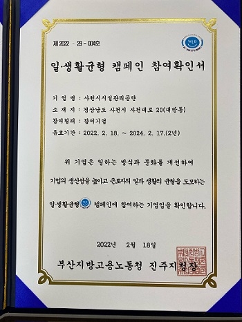 사천시시설관리공단은 고용노동부가 주관하는 '2022년 일·생활 균형 캠페인' 참여기업에 선정됐다고 2일 밝혔다.