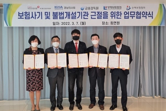 국민건강보험공단 부산울산경남지역본부는 7일 창원 소재 식당에서 경남도의사회, 금융감독원, 생명보험협회, 손해보험협회와 불법개설기관 및 보험사기 근절을 위한 업무협약(MOU)을 체결했다.