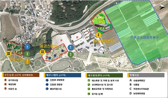 군은 4년간 180억 원(국비 90, 지방비 90)을 투입해 유기농복합단지 구성계획인 1구역의 에코힐링센터는 3층 복합건물로 레스토랑, 카페, 전시장, 교육장 등을 건립하고 2구역인 에코스테이는 친환경 글램핑·캠핑장으로 3구역인 모두농장에는 체험프로그램 운영을 위한 체험텃밭, 치유의 숲을 조성하여 차별화된 서비스를 제공할 계획이다.