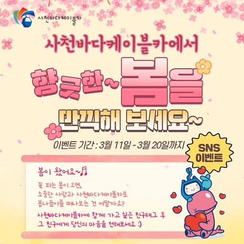 사천시시설관리공단이 봄을 맞아 오는 20일까지 '사천바다케이블카에서 향긋한 봄을 만끽해 보세요~' SNS 이벤트를 진행한다.