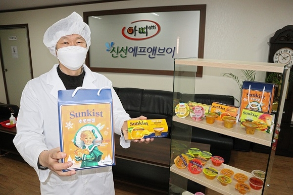 15일 신선에프앤브이에 따르면 글로벌 식음료 브랜드인 '썬키스트'의 상표를 단 과일젤리가 미국시장으로 수출되는 것은 전 세계에서 처음이다.