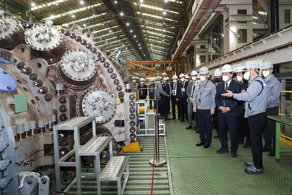 이번 방문은 국산 가스터빈 1호기 제작에 노력한 두산중공업 임직원과 초도품 품질인증을 받은 19개 참여 협력사 대표를 격려하기 위해 추진됐다.