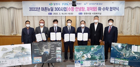 경남 창원시는 지난 16일 시정회의실에서 올해 정부 공모사업으로 선정된 어촌뉴딜300사업의 성공적인 추진을 위해 한국어촌어항공단 및 한국농어촌공사와 사업 위·수탁 협약을 체결했다.