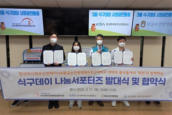 이번 협약식에는 '식구데이' 행사 취지에 공감하고 참여의 뜻을 밝힌 황금손한방병원과 부산대학교 약학대학 봉사동아리 '약천'이 함께했다.