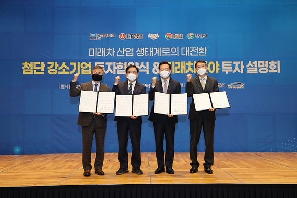 창원시는 23일 오후 창원컨벤션센터에서 경남도와 함께 관내 미래차 관련 핵심부품 생산기업인 해성디에스㈜, 엘티정밀㈜과 투자금액 4200억, 신규고용 370명 규모의 투자협약(MOU) 체결과 함께 한국자동차연구원이 주관하는 미래차 분야 투자유치 설명회를 가졌다.