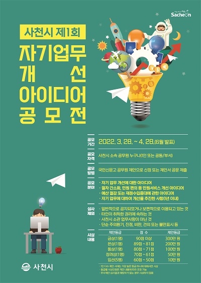 경남 사천시는 공무원의 자기 업무 개선을 통한 행정업무의 효율성을 높이기 위해 '2022년 제1회 자기 업무 개선 아이디어 공모전'을 실시한다고 29일 밝혔다.