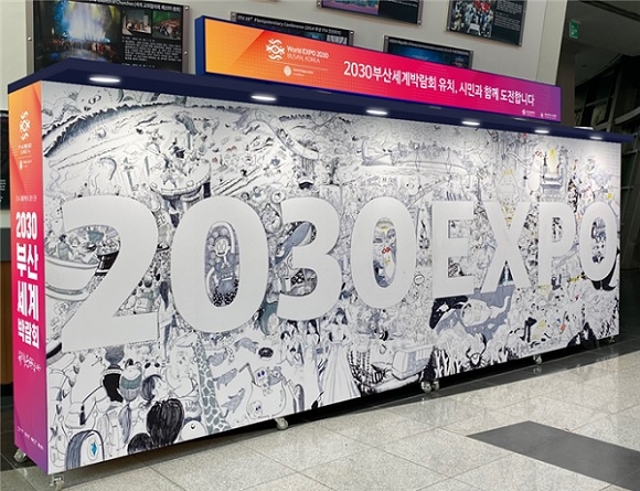 부산의 웹툰작가인 황가은 씨, 멘토스쿨, 마스터클래스 5개팀이 공동 참여해 라이브 드로잉쇼에서 제작한 대형 웹툰작품에 2030부산세계박람회 유치기원 홍보문안을 새겨 넣은 LED간판을 설치하고 스포트라이트 조명으로 포토존을 완성했다.