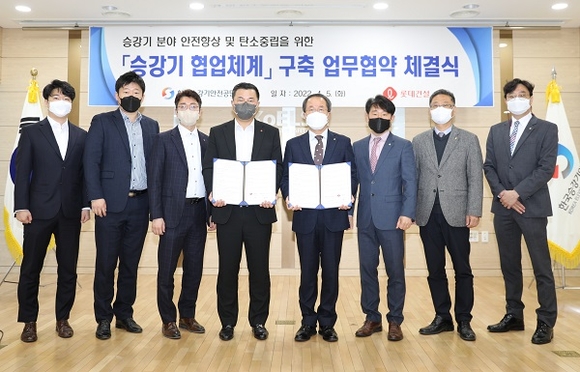 한국승강기안전공단과 롯데건설(주)은 5일 공단 본부에서 '공동주택 승강기 품질 향상 및 사회적 책임 ESG 경영 실천'을 위한 업무협약을 체결했다.