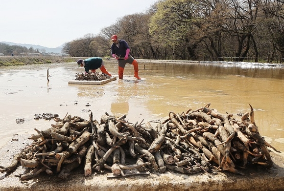 청명이자 식목일인 5일 경남 함양군 상림공원 연꽃단지에서 인부들이 홍연 모종을 심고 있다. (사진=함양군 제공)