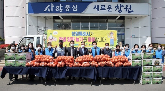 경남 창원시가 양파 소비감소와 가격폭락으로 어려움을 겪고 있는 창녕군 양파농가 돕기에 나섰다.