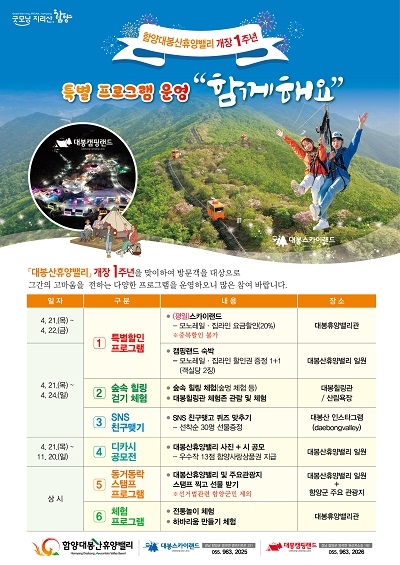 특히 대봉산휴양밸리는 개장 1주년을 기념하며 대표 시설인 모노레일·집라인 등의 요금 할인도 진행하여 방문객들이 보다 저렴하게 시설을 이용할 수 있도록 했다.