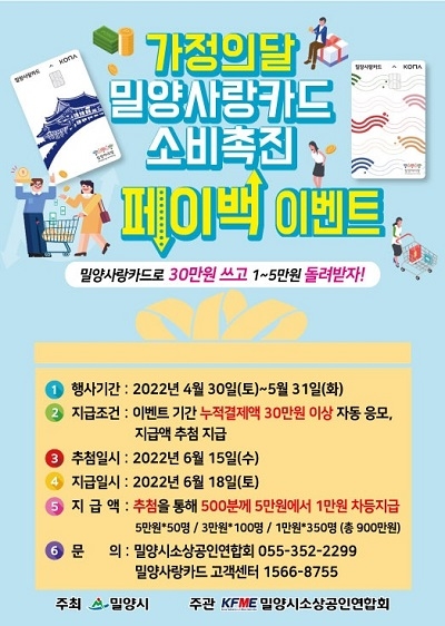경남 밀양시가 5월 가정의 달을 맞아 코로나19 장기화로 침체된 지역 경제회복을 유도하고 지역 내 소비 촉진을 위해 '밀양사랑카드 소비촉진 페이백 이벤트'를 진행한다.