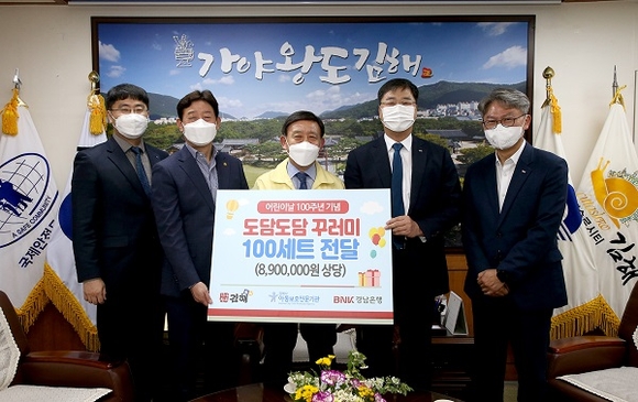 어린이날 100주년을 기념해 BNK경남은행이 보호아동 100세대를 지원하기 위해 890만원 상당의 도담도담 꾸러미를 21일 김해시에 전달했다.