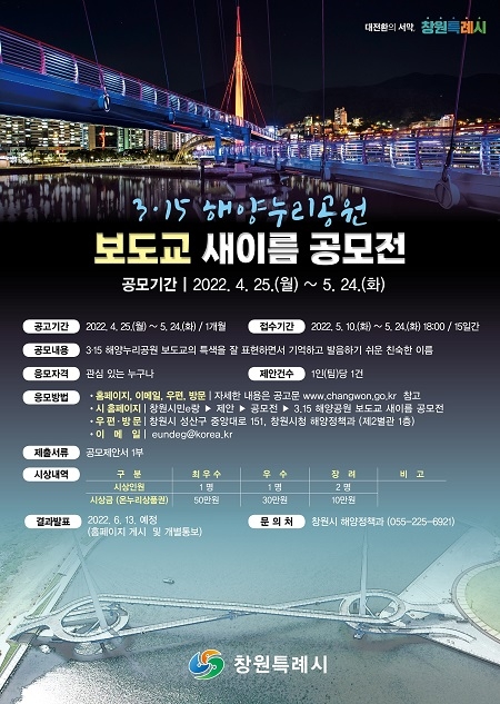 경남 창원시는 3·15해양누리공원 '보도교'의 새이름을 찾기 위한 공모전을 연다고 26일 밝혔다.