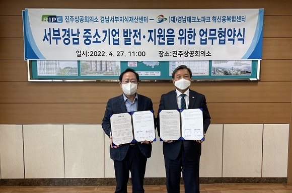 경남테크노파크(경남TP) 혁신융복합센터는 지난 27일 진주상공회의소 경남서부지식재산센터와 경남 서부지역 산업발전 및 중소기업 경쟁력 제고를 위한 업무협약을 체결했다.