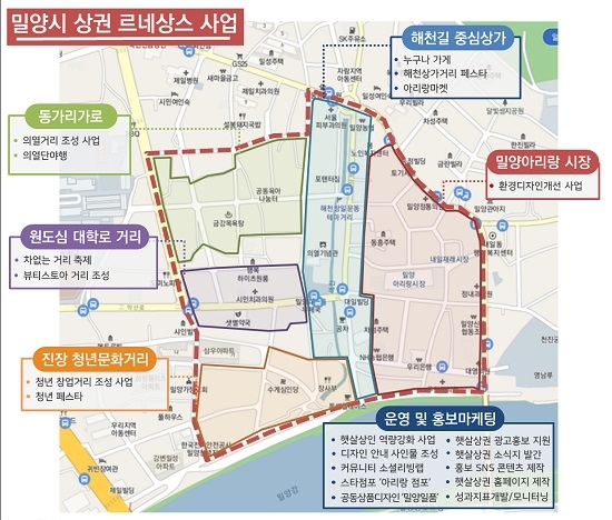 밀양시 상권르네상스 사업은 올해부터 2026년까지 5년간 사업비 60억원으로 '밀양 원도심 햇살문화상권(다시 햇살 좋은 날)'의 비전 아래 역사, 인물, 문화를 테마로 상권구역을 설정하고, 밀양아리랑시장, 해천길 중심상가 거리, 원도심 대학로 거리, 진장 청년문화 거리, 동가리 가로 거리로 구역을 특성화해 사업을 추진한다.