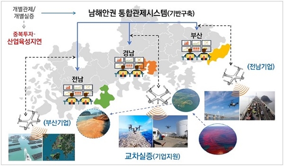 3개 지자체의 테크노파크가 공동으로 사업을 수행하게 되며 무인이동체를 활용하여 남해안권 통합 모니터링(적조, 양식장)과 시설물 안전점검, 도서 간 물품배송 및 교통량 분석 등을 교차 실증하고, 연계 협력 시너지를 극대화하기 위해 통합관제 시스템을 구축하게 된다.