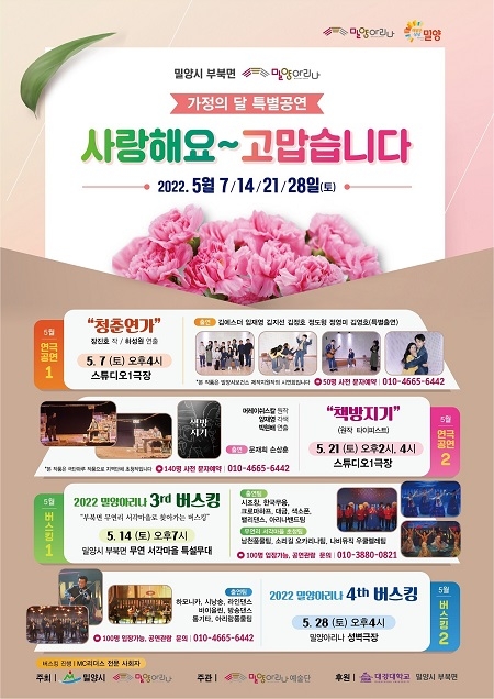 경남 밀양시와 밀양아리나는 5월 가정의 달에 맞는 연극과 버스킹을 준비해 매주 토요일에 특별공연을 선보인다.