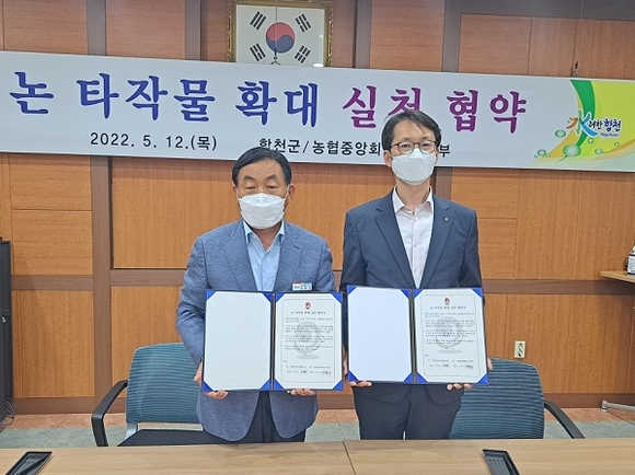 경남 합천군은 지난 12일 군농업기술센터 소회의실에서 농협중앙회 합천군지부와 논 타작물 실천 협약을 체결했다.