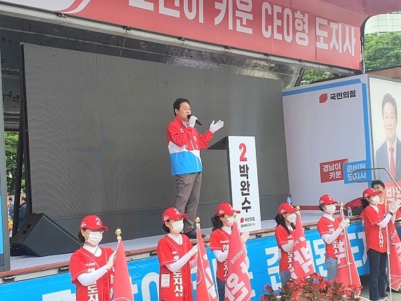 박완수 국민의힘 경남도지사 후보가 선거운동 첫날인 19일 오전 창원 의창구 창원광장 옆 최윤덕 장군 동상 앞에서 출정식을 갖고 유세 연설을 하고 있다. (사진=최원석 기자)