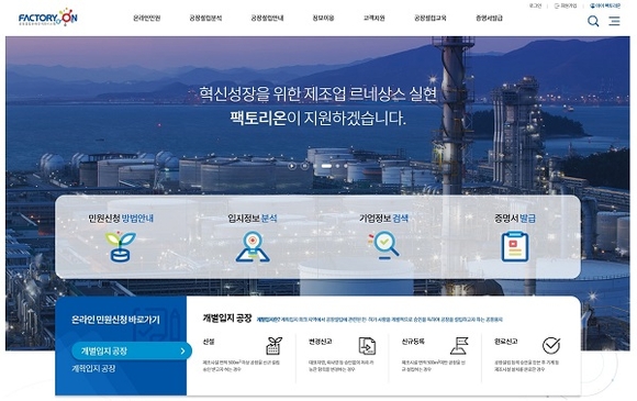 'Factory On'은 「산업집적활성화 및 공장설립에 관한 법률」 제6조의 2에 따라 산업통상자원부, 한국산업단지공단, 광역 지자체가 협력해 운영하는 시스템으로 ▲온라인 민원신청 서비스 ▲공장설립 분석 서비스 ▲기업정보 제공 서비스 등으로 구성돼 있다.