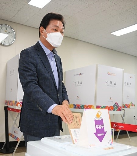 박완수 국민의힘 경남도지사 후보가 6.1지방선거 사전투표 첫날인 27일 오전 창원 의창구 팔용동 행정복지센터를 방문해 소중한 한 표를 행사하고 있다. (사진=박완수 선거캠프 제공)