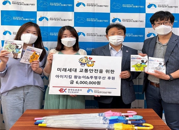 한국도로공사 부산경남본부는 지난 7일 어린이 교통안전을 위해 '아이지킴 왕눈이(800개)'와 '투명우산(400개)'을 제작, 지역아동센터 경남도지원단에 전달했다고 8일 밝혔다.