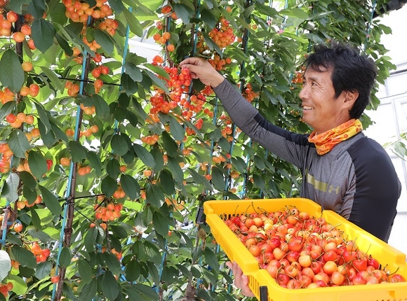 13일 경남 함양군 함양읍 가재골 체리농장에서 한 농민이 탐스럽게 잘 익은 체리를 첫 수확하고 있다. (사진=함양군 제공)