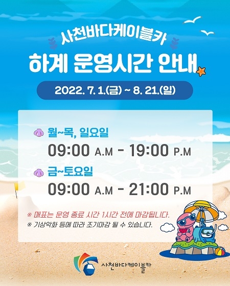 사천시시설관리공단은 사천바다케이블카가 7월 1일부터 8월 21일까지 여름 휴가철을 맞아 운영시간을 최대 2시간까지 연장한다고 29일 밝혔다.