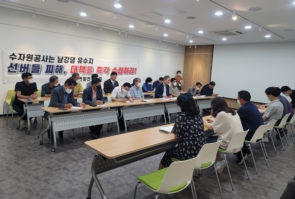 사천시 곤명면발전위원회와 곤명면이장협의회, 시의원 2명 등 곤명면 조직단체 대표단이 30일 유수지내 서식하는 선버들로 인한 피해대책을 호소하며 한국수자원공사 남강댐지사를 항의 방문했다.