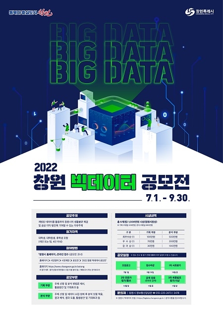 경남 창원시는 시민의 생활불편 해결 및 공공 이익과 발전에 기여할 창의적 빅데이터 활용 아이디어와 서비스 발굴을 위한 '2022 창원 빅데이터 공모전'을 개최하고 있다고 4일 밝혔다.