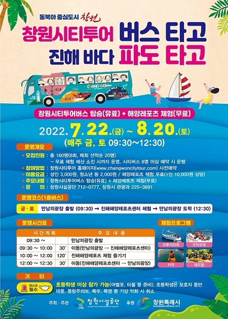 경남 창원시는 오는 22일부터 8월 20일까지 매주 금·토요일 시티투어버스 탑승자에게 해양레포츠 체험 기회를 준다고 20일 밝혔다.