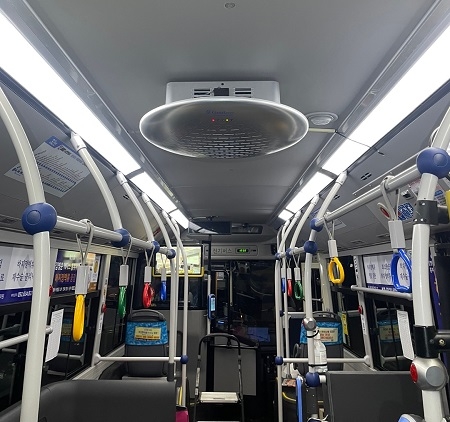 버스 천장에 설치된 유해공기살균청정기(에어백신 울트라)는 필터가 기존제품과 달리 미세먼지를 걸러주는 공기청정기 기능은 물론 바이러스 사멸(CAZ필터) 및 필터 사이 부착된 세균까지 살균하는 5단계 살균과정을 거쳐 청정한 공기를 내보낸다.